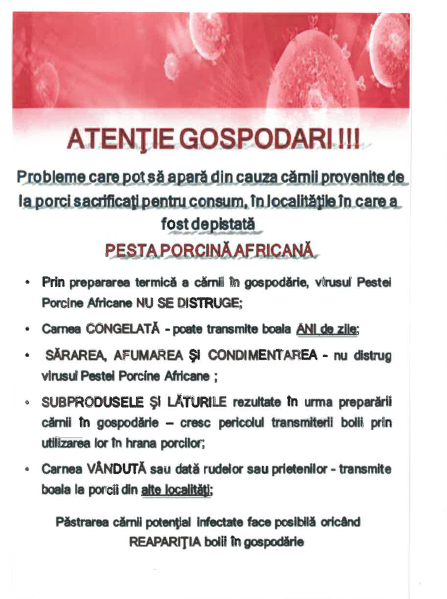 Informare, atentionare privind posibila aparitie a pestei porcine africane pe teritoriul Romaniei